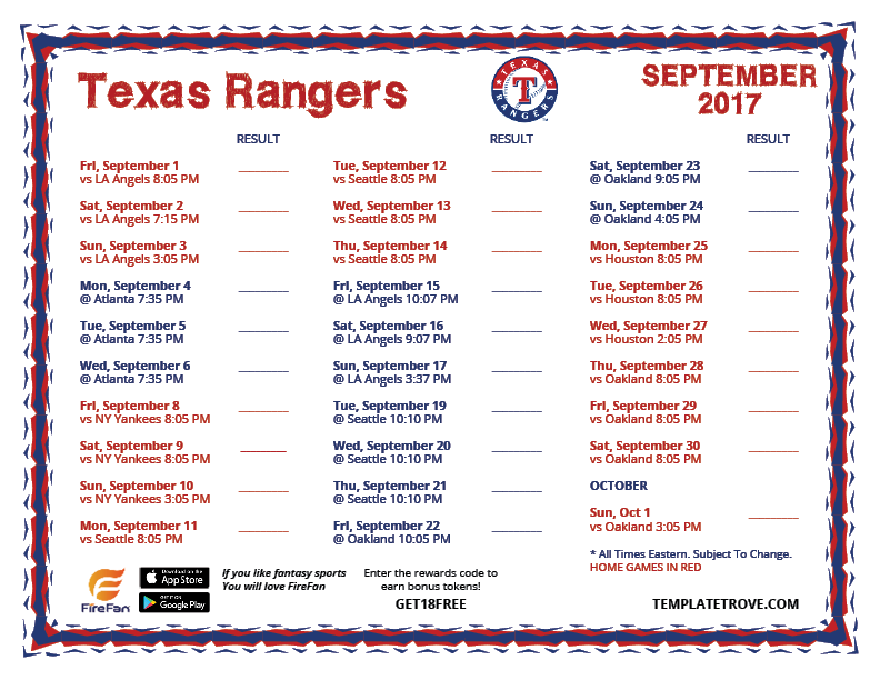 Texas Rangers Printable Schedule 2025. Starting pitchers are jon gray for the rangers and daniel lynch iv for the royals. Explore the 2025 texas rangers mlb roster on espn.